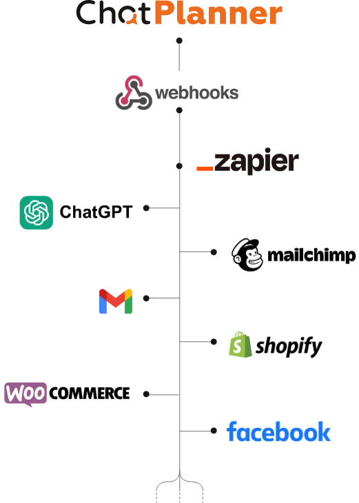 ChatPlanner si integra facilmente con una vasta gamma di strumenti e piattaforme per ottimizzare il tuo marketing su WhatsApp. Le integrazioni includono software popolari come Zapier, Mailchimp, Google Calendar, Shopify, WooCommerce, Facebook e molti altri.